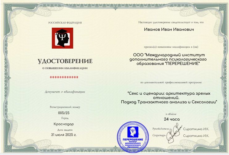 Запишитесь на курс «Секс и сценарии: архитектура зрелых отношений» прямо сейчас — откройте новые профессиональные горизонты и получите современные инструменты для эффективной работы с темой зрелых парных отношений! Не откладывайте — начните профессиональное развитие вместе с нами уже сегодня!