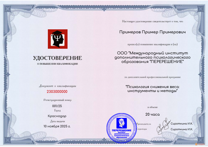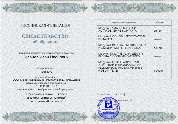 — (Если вы проходите курс для себя без диплома психолога) потребуется только паспорт и вы получите Свидетельство о прохождении обучения